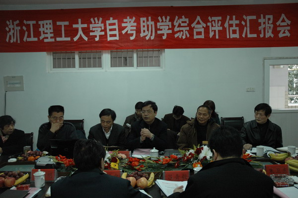 汇报会由专家组组长、原浙江工商大学副校长丁正中教授主持。陈建勇代表学校对各位专家的到来表示热烈欢迎,并强调我校非常重视自考助学工作,学校领导多次开会研究自考助学招生、教学和日常管理工作,目前教学秩序稳定,教学质量逐年提高。陈建勇衷心并热切地希望各位专家在评估期间不吝赐教,为我校自考助学工作的改进、提高和发展多提宝贵意见和建议。成教学院党总支书记兼院长作了我校自考助学工作汇报。汇报共分五部分:基本情况概述、自评情况、存在的问题与努力的方向。汇报提到,我校自考助学历史不长,但学校坚持“以人为本”的办学理念,以“建设校园文化,开展素质教育,提高教学质量”为内涵,推行“理论与实践相结合,文凭与资证相结合,专业与就业相结合”的办学方针,三年来,课程通过率逐年提高,学生稳定,校园和谐,办学状况良好。通过评估,我校也发现自考助学工作存在一些问题,但这些问题都是发展中的问题,相信在专家的指导下,我校的自考助学工作会更加健康发展。