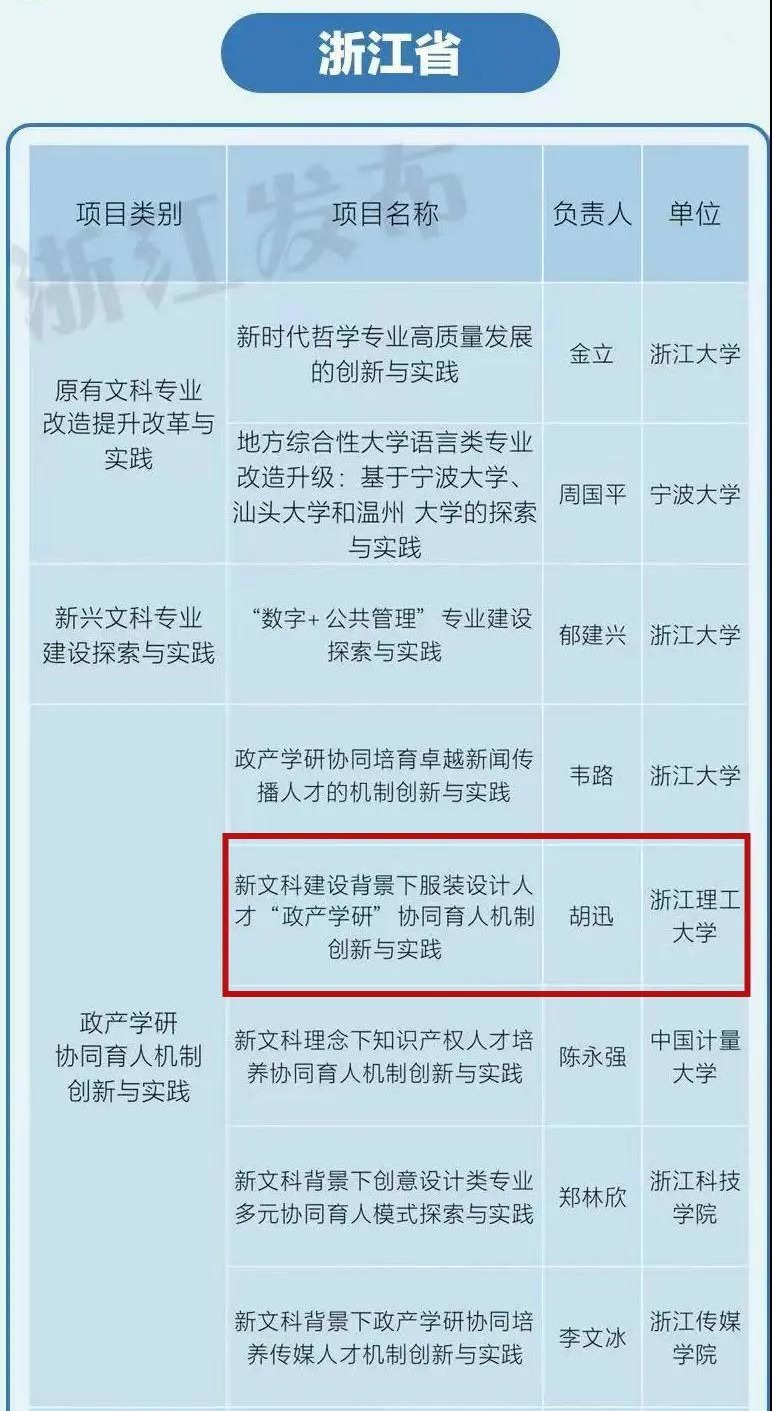 教育部新文科研究与改革实践项目为国家级教学改革项目,面向全国普通高校开展,设新文科建设发展理念、专业优化、人才培养模式改革、重点领域分类推进、师资队伍建设、特色质量文化建设研究6个选题领域、22个选题方向。首批认定项目1011个,浙江共有16所高校的26个项目获批立项。