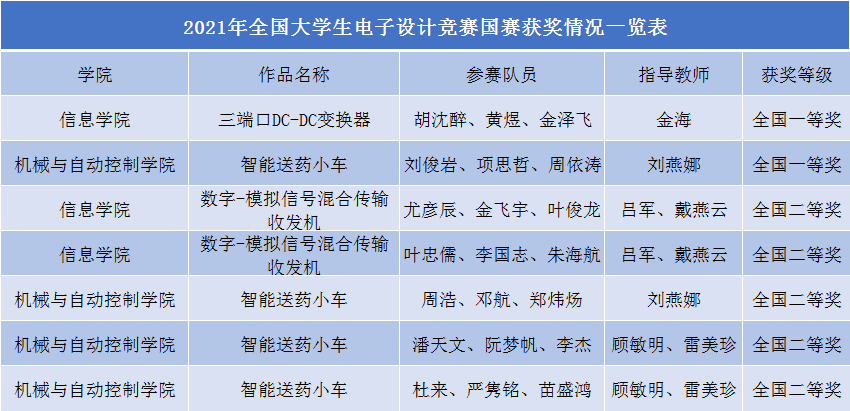 近日,我校学子在2021年全国大学生电子设计竞赛中喜获佳绩,斩获国家级一等奖2个、国家级二等奖5个、浙江省一等奖3个,浙江省二等奖13个,浙江省三等奖25个,国奖数位列全省第二,创历史最好成绩。