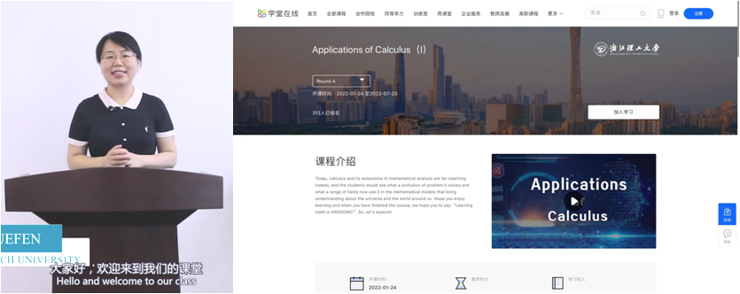 《微积分应用》课程讲授一元微积分的基本概念及其应用,共含有40余个应用案例。教学兼顾直观性、应用性、历史性,注重讲述微积分的源与流,融合了精美的动画、实物教具等资源,采用英文讲授并配以中英文字幕,生动有趣、内容丰富,适合中外大学生及社会人士学习。课程负责人高雪芬教授以《高等数学B* 》(全英)课程教学参评,荣获2021“浙江省首届届高校教师教学创新大赛”正高组一等奖、教学学术创新奖等。