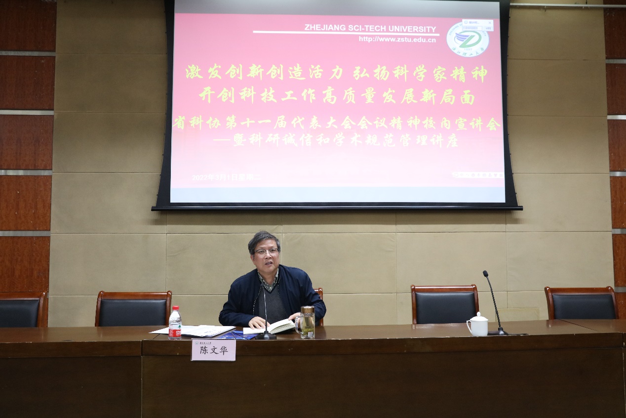 为宣贯浙江省科协第十一届代表大会会议精神,倡导科研诚信和学术规范管理重要性,校科学技术协会于3月1日下午举办省科协第十一届代表大会会议精神校内宣讲会暨科研诚信和学术规范管理讲座。校科协主席、副校长陈文华出席。浙江大学教授、浙江省医学科研管理学会主委易平在会上作专题讲座。