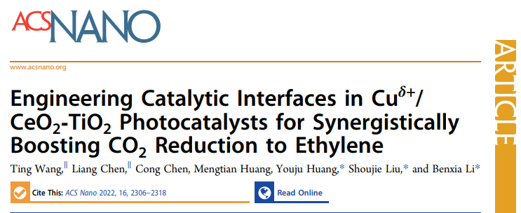 近日,mk官方网站_mk(中国)理学院化学系、浙江省高分子表界面科学重点实验室教师李本侠教授课题组在国际著名期刊ACS Nano(IF = 15.881)发表了题为“Engineering Catalytic Interfaces in Cuδ+/CeO2-TiO2Photocatalysts for Synergistically Boosting CO2Reduction to Ethylene”的研究论文(DOI: 10.1021/acsnano.1c08505)。我院博士研究生王挺为论文的第一作者,杭州师范大学陈靓博士为共同第一作者,mk官方网站_mk(中国)理学院化学系李本侠教授、杭州师范大学黄又举教授、化学与精细化工广东省实验室的柳守杰副研究员为论文的共同通讯作者,我校为第一完成单位。