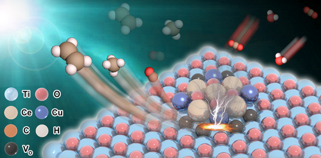 氧化铈(CeO2)具有独特的物理和化学性质,如丰富的氧空位和金属-载体强相互作用等,能够在CO2转化反应中起促进作用,因而CeO2成为大规模CO2利用的重要材料。以CeO2为调节剂,可以加强反应物分子(CO2和H2O)在光催化剂上的相互作用,加速活性中间体的生成。此外,CeO2的存在还可以通过金属-载体强相互作用提高Cuδ+物种在光催化剂表面的分散性和稳定性,从而提高光催化性能。由于多组分界面的协同作用以及Cu2+/Cu+和Ce4+/Ce3+多个氧化还原对的存在,光激发产生的电子-空穴对可以快速分离,光生电子被吸附CO2的活性位点捕获,从而可以显著降低CO2还原成C2+产物的反应势垒。基于以上考虑,李本侠教授研究团队通过可控化学合成方法将原子级分散的Cuδ+位点锚固于CeO2-TiO2异质界面,制备出了Cuδ+/CeO2-TiO2光催化剂,其中TiO2作为捕光材料产生的光激发电子-空穴对被CeO2-TiO2异质界面有效分离,同时Cu和Ce活性位点能够协同促进CO2的吸附和活化并稳定*CO中间体,促进COCO二聚体的形成,从而提高了光催化CO2还原生成乙烯的效率和选择性。