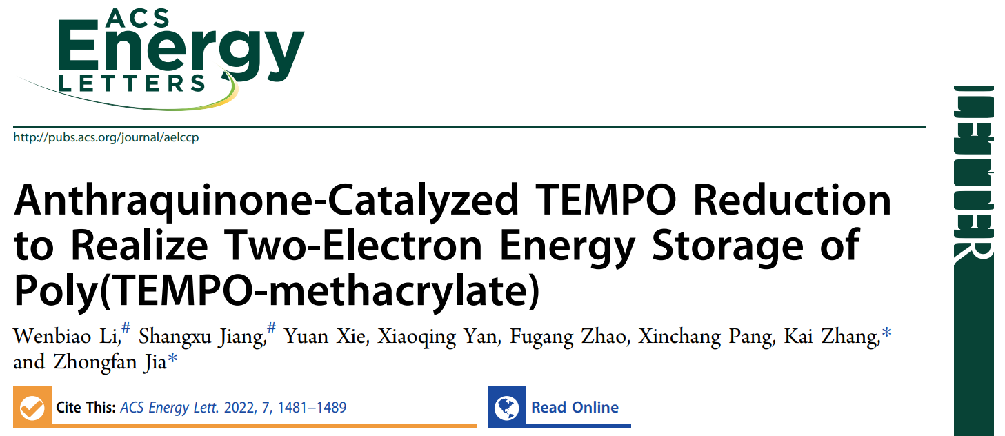 近日,mk官方网站_mk(中国)理学院化学系张凯博士在国际知名期刊ACSEnergyLetters(2021年影响因子23.101)发表了题目为《Anthraquinone-Catalyzed TEMPO Reduction to Realize Two-Electron Energy Storage of Poly(TEMPO-methacrylate)》的研究论文。理学院研究生李文彪和蒋尚旭为论文共同第一作者,张凯博士和弗林德斯大学贾中凡博士为论文的共同通讯作者,我校为第一完成单位。