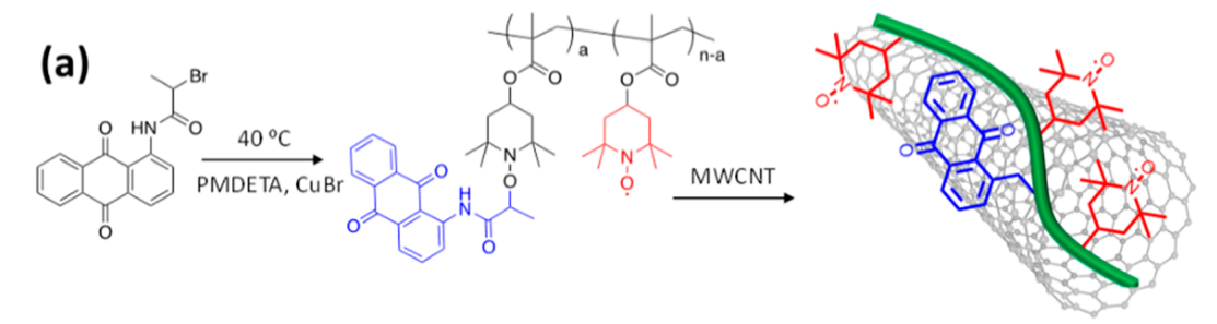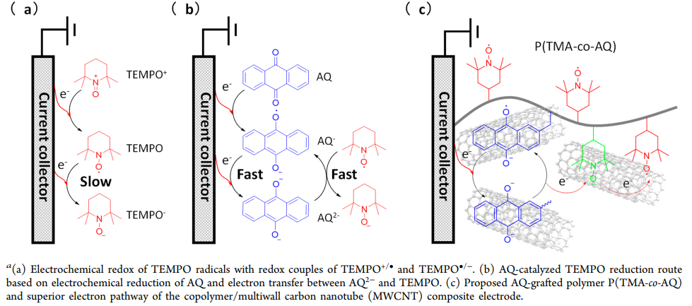 张凯博士课题组前期的工作中已证实相比于氧化态下的第一电子过程,还原态下第二电子在电极表面及聚合物层中传输动力学过程缓慢,因而导致电极的两电子储能性能较低。基于前期的研究,首次引入氧化还原媒介蒽醌(AQ)到自由基聚合物电极材料,从聚合物结构设计层面及电化学过程提高氮氧自由基聚合物的电化学性能。首先,在小分子体系中进行了催化过程的研究,通过循环伏安法(CV)表征,确定AQ-/AQ2-的还原电位略低于TEMPO•/–,满足了其作为氧化还原媒介的标准;通过原位红外技术表征了AQ催化TEMPO的电荷转移过程。并且具有平面共轭结构的AQ作为氧化还原媒介,其与碳纳米管的π-π相互作用协同降低了聚合物电极中非均相电荷转移电阻,并加速了TEMPO•/–界面过程的动力学。