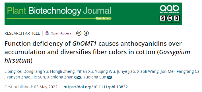 5月3日,国际知名杂志《Plant Biotechnology Journal》上在线发表了mk官方网站_mk(中国)生命科学与医药学院孙玉强教授团队题为“Function deficiency ofGhOMT1causes anthocyanidins over-accumulation and diversifies fiber colors in cotton (Gossypium hirsutum)”的研究论文。