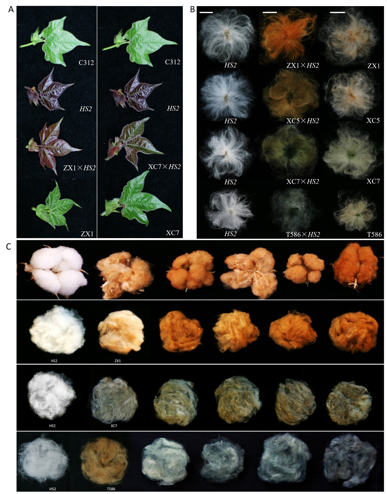 天然彩色棉中次生代谢的苯丙烷和黄烷酮类的衍生物是彩色棉纤维的主要呈色物质,包括花青素或原花青素或苯乙烯酸类物质以及它们衍生物,作为次生代谢产物含量都比较低。紫化突变体HS2在整个生育期都可以产生大量花青素,含量增加、种类改变,为纤维颜色改良提供重要的物质基础。前期研究表明彩色棉棕色纤维由原矢车菊素和原飞燕草素及其衍生物累积纤维腔呈色,主要由于黄酮类化合物代谢酶基因上调表达,特别是花青素还原酶GhANR基因的优势表达,导致棕色纤维中的黄酮类化合物积累明显高于白色棉纤维。HS2突变体从茎、叶到花、铃等器官都呈现紫色,而纤维颜色却没有改变,可能与突变体中GhANR和GhLAR表达水平未显著升高相关,导致纤维中原花青素累积不够,仍然呈现白色。那么HS2能否用于彩色纤维的遗传改良从而使纤维颜色加深甚至呈现新的颜色呢?