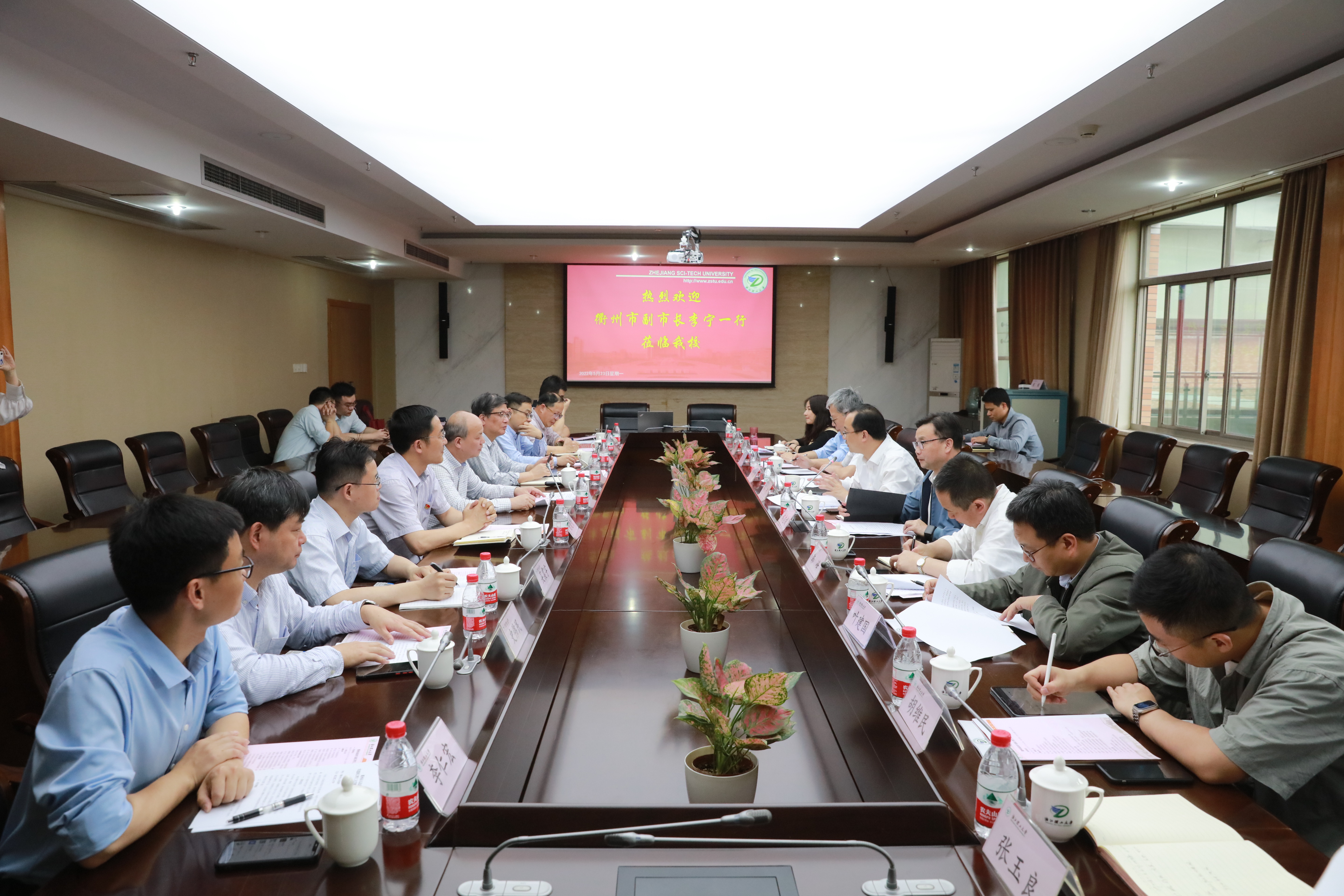 5月23日下午,衢州市副市长李宁,科技局、经信局、财政局、制造新城管委会、交投集团等部门负责人来校交流合作。校长陈文兴、副校长陈文华在308会议室接待了来宾。