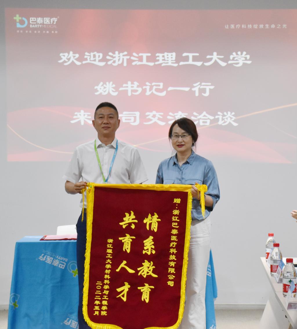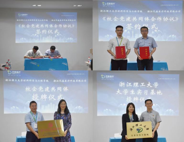 “巴泰励志奖学金”研究生、本科生代表发言,他们表示,将带着这份感激感恩感动奋发图强,锚定目标,勇敢进发,努力在未来获得更加优异的成绩!材料科学与工程学院材料工程系教工党支部书记张权与浙江巴泰医疗科技有限公司党支部书记饶帅辉签订《校企党建共同体合作协议》。材料学院党委书记仰滢与巴泰医疗总经理杜瑞林共同为校企党建共同体揭牌。材料学院党委副书记周照东与巴泰公司人力资源总监俞秋一共同为大学生实习基地揭牌。