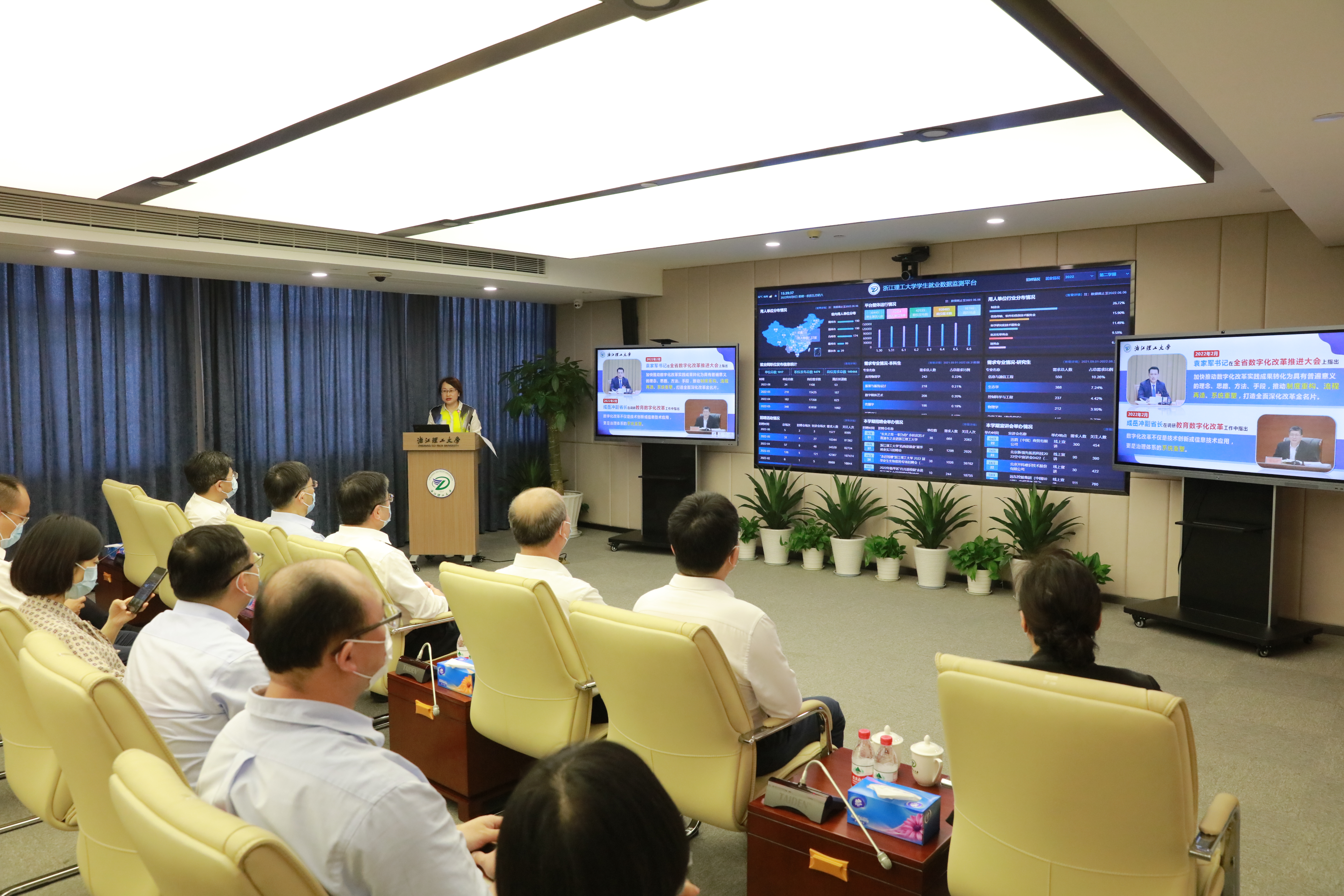 在专题汇报现场,成岳冲充分肯定了学校依托数智就业服务平台为毕业生提供精准服务,加强就业教育引导的做法,希望学校进一步提升智慧就业服务水平,全力帮助每一位大学生就好业。姚珺作专题汇报,她从精准识别就业行为,推动就业流程线上重造;精准进行就业预警,推动就业工作模式重塑;精准反馈社会需求,推动人才培养链条重构三个方面介绍了我校在数字化改革促就业上的特色做法,现场展示学生就业数据监测大屏。