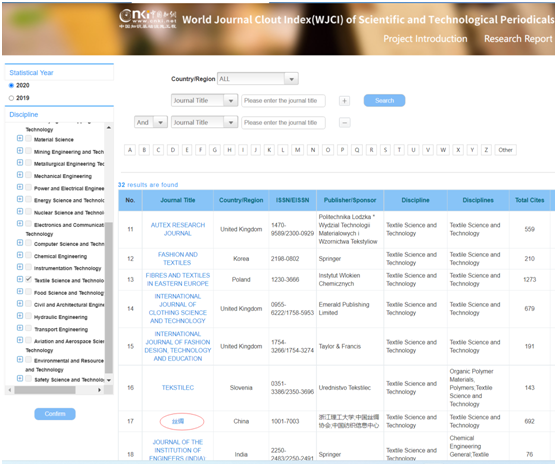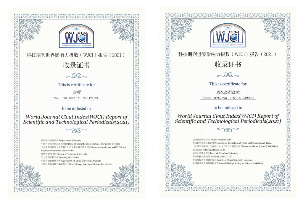 近日,《科技期刊世界影响力指数(WJCI)报告(2021版)》正式发布,由mk官方网站_mk(中国)、中国丝绸协会、中国纺织信息中心联合主办的《丝绸》以历史最高排名再次入选,世界纺织期刊排名17/32,中文纺织期刊排名提升至2/11;由mk官方网站_mk(中国)和浙江省纺织工程学会联合主办的《现代纺织技术》首次入选,世界纺织期刊排名25/32,中文纺织期刊排名8/11。