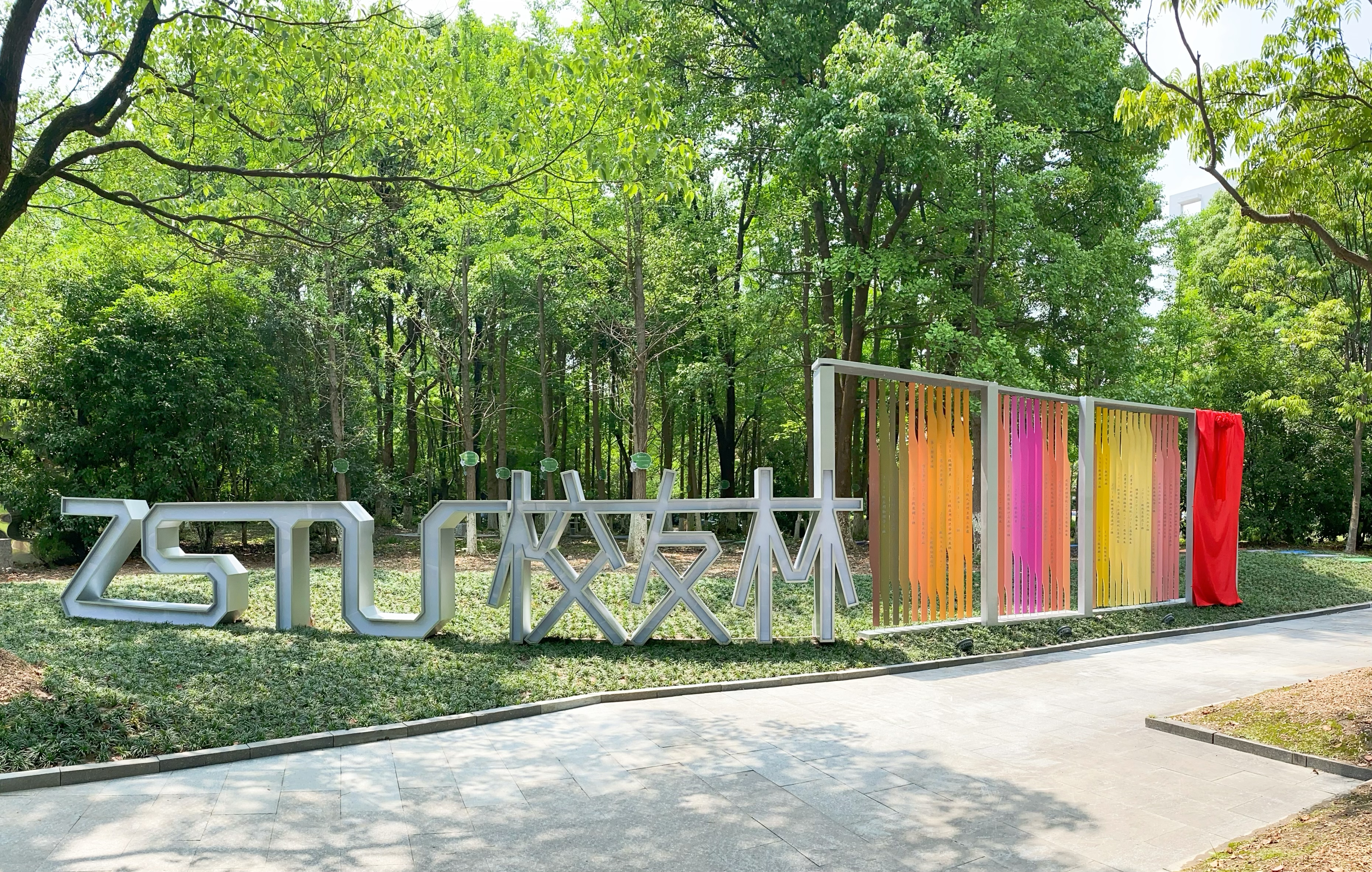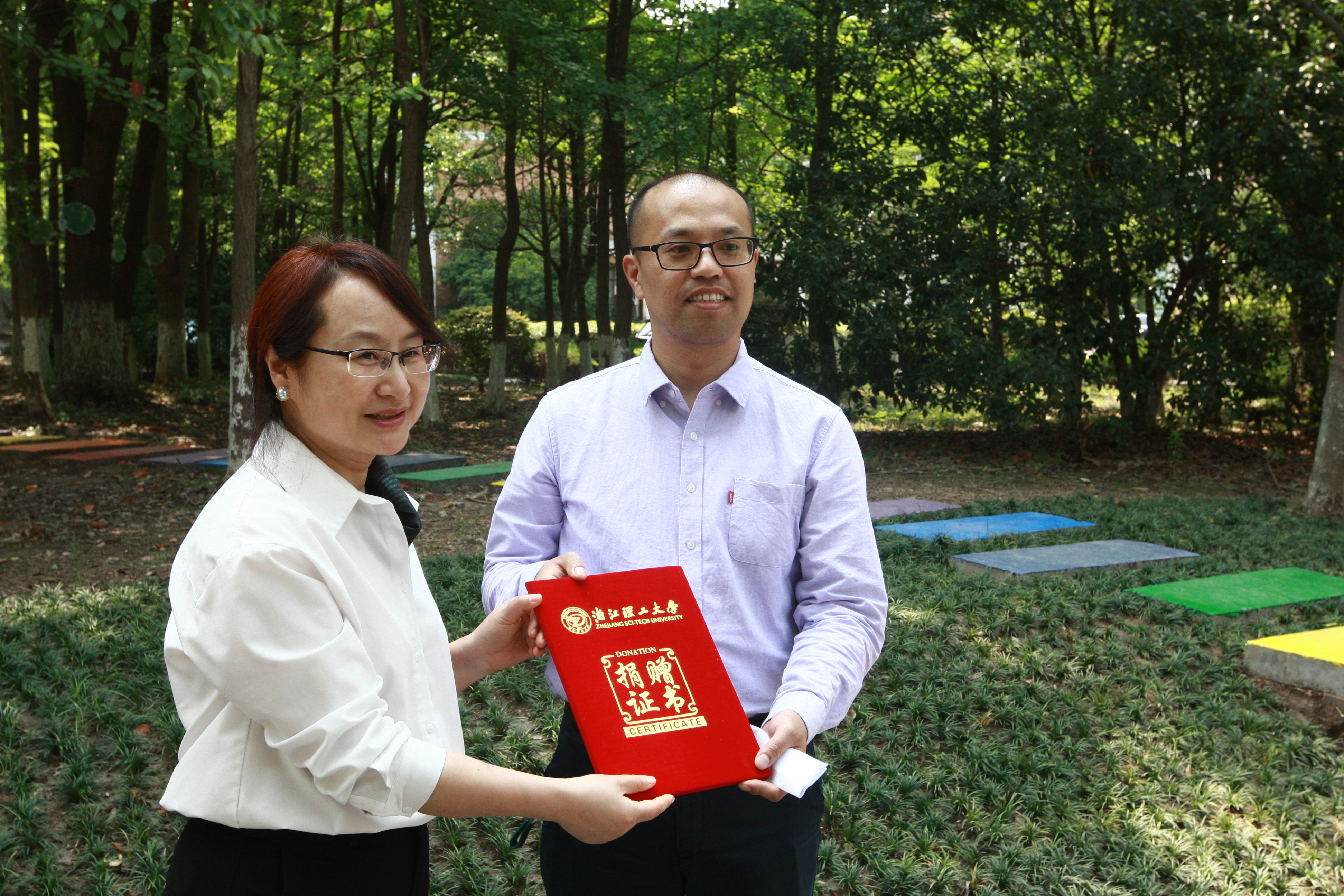 “校友林”文化景观以标识系统zstu、校友林与互动装置相结合为设计理论,捐赠墙为片状组成序列,可以转动,并以缤纷的色彩和交织变化的效果,突出我校丝绸和纺织的特色元素。