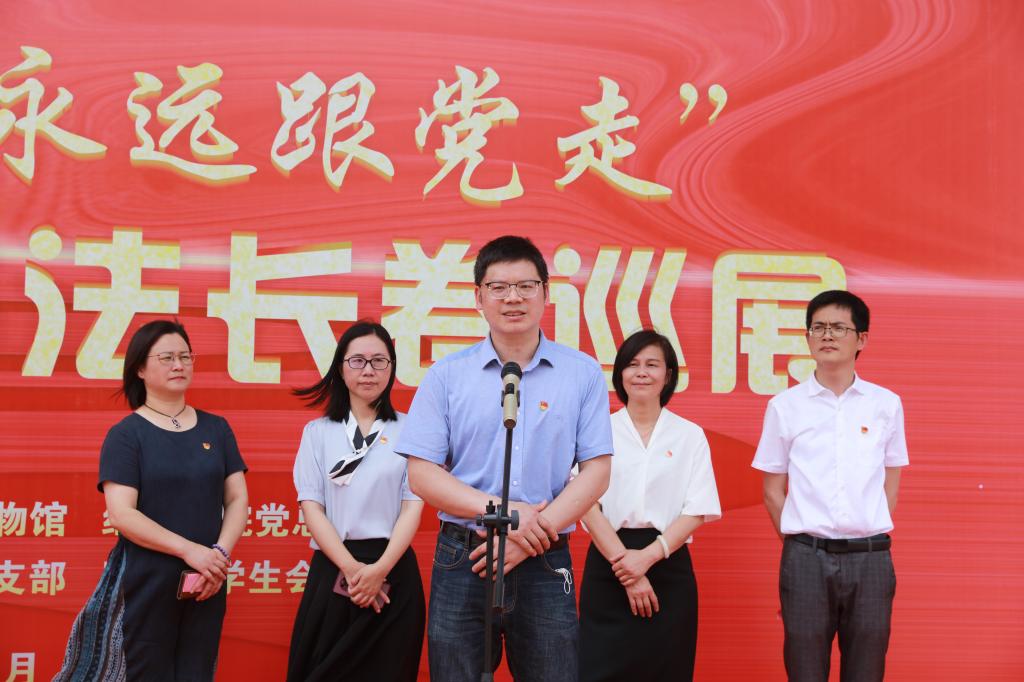 开幕式上,校丝绸博物馆长葛建纲致辞。他指出,陈洪标结合书法艺术和红色文化,让书法长卷成为艺术+思想政治教育的鲜活教材,是一次高质量的党史学习教育。用百米长卷书写光辉党史,讲好红色故事,守护红色根脉,用伟大建党精神滋养斗志、浸润心田、激励品性、激发活力,体现了陈洪标老师对党的忠诚和深情礼赞。