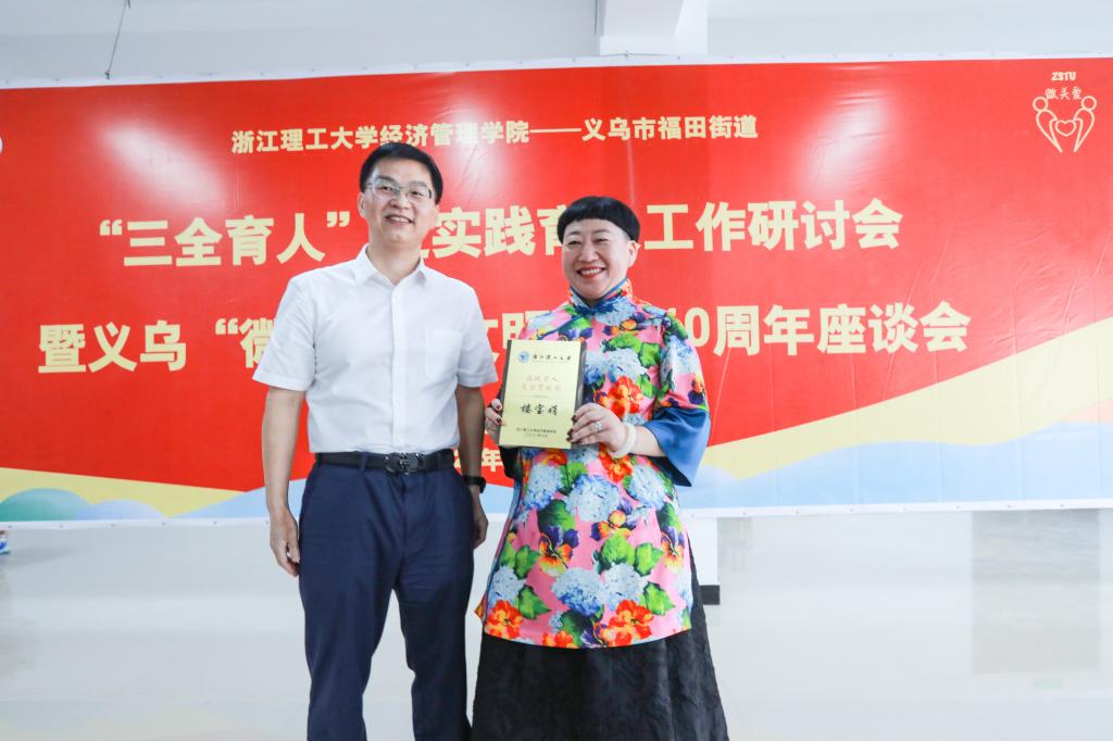 活动现场,王剑俊为义乌“微关爱”文明实践活动主要发起人楼宝娟女士颁发了“mk官方网站_mk(中国)实践育人突出贡献”荣誉证书。经济管理学院院长潘旭伟为楼宝娟等9人等颁发了mk官方网站_mk(中国)彩虹引领工程之校外实践导师聘书。教务处处长王尧骏,福田街道党工委副书记、办事处主任陈英能共同为“mk官方网站_mk(中国)大学生劳动教育实践基地”揭牌。