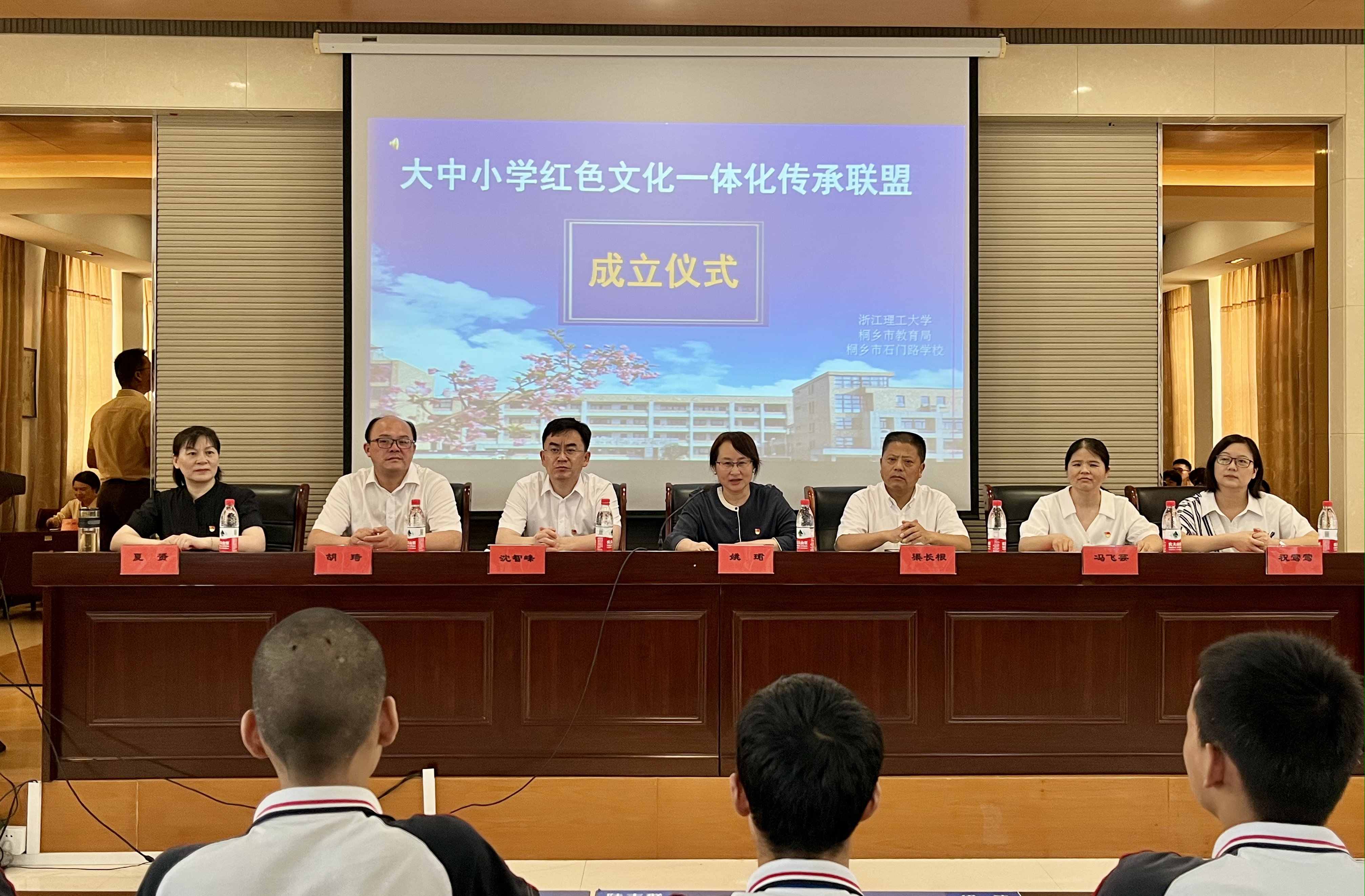 当天下午,嘉兴首个大中小学红色文化一体化传承联盟共建仪式在桐乡市石门路学校举行,姚珺,教育部思政课教指委委员、全国红色文化研究会常务理事,我校渠长根教授,嘉兴桐乡市政府领导沈智峰,校党委学工部、党委研工部、团委及科艺学院、机控学院负责人,桐乡市教育局、文化馆、石门路学校负责人出席共建仪式。
