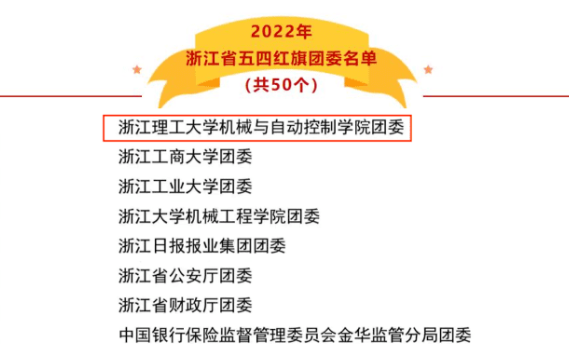 近日,共青团浙江省委决定授予50个团组织浙江省五四红旗团委称号;授予50个团组织浙江省五四红旗团支部称号;授予113名同志浙江省优秀共青团员称号;授予80名同志浙江省优秀共青团干部称号。其中,我校机械与自动控制学院团委获“浙江省五四红旗团委”称号。该荣誉称号每5年评选一次,是共青团浙江省委授予基层团组织的最高荣誉。