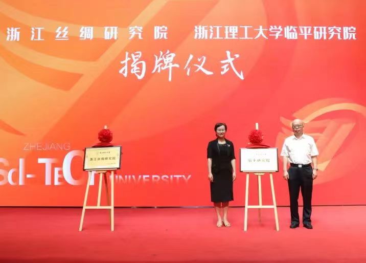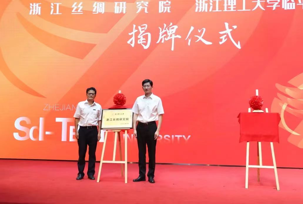 活动现场,谢渐升、陶伟华为“浙江丝绸研究院”揭牌。
