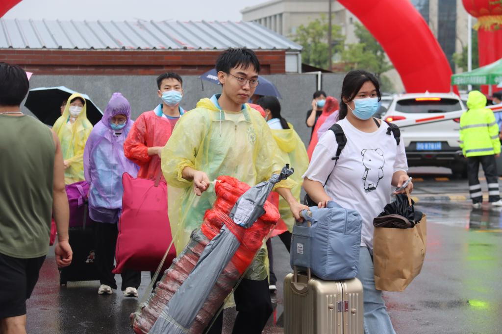 保安和负责行李托运的工作人员不言辛苦,妥善运送并安置好新生行李;学生志愿者们冒雨帮学弟学妹搬运行李,耐心给新生引导、答疑,忙碌的脚步在校园里穿梭。