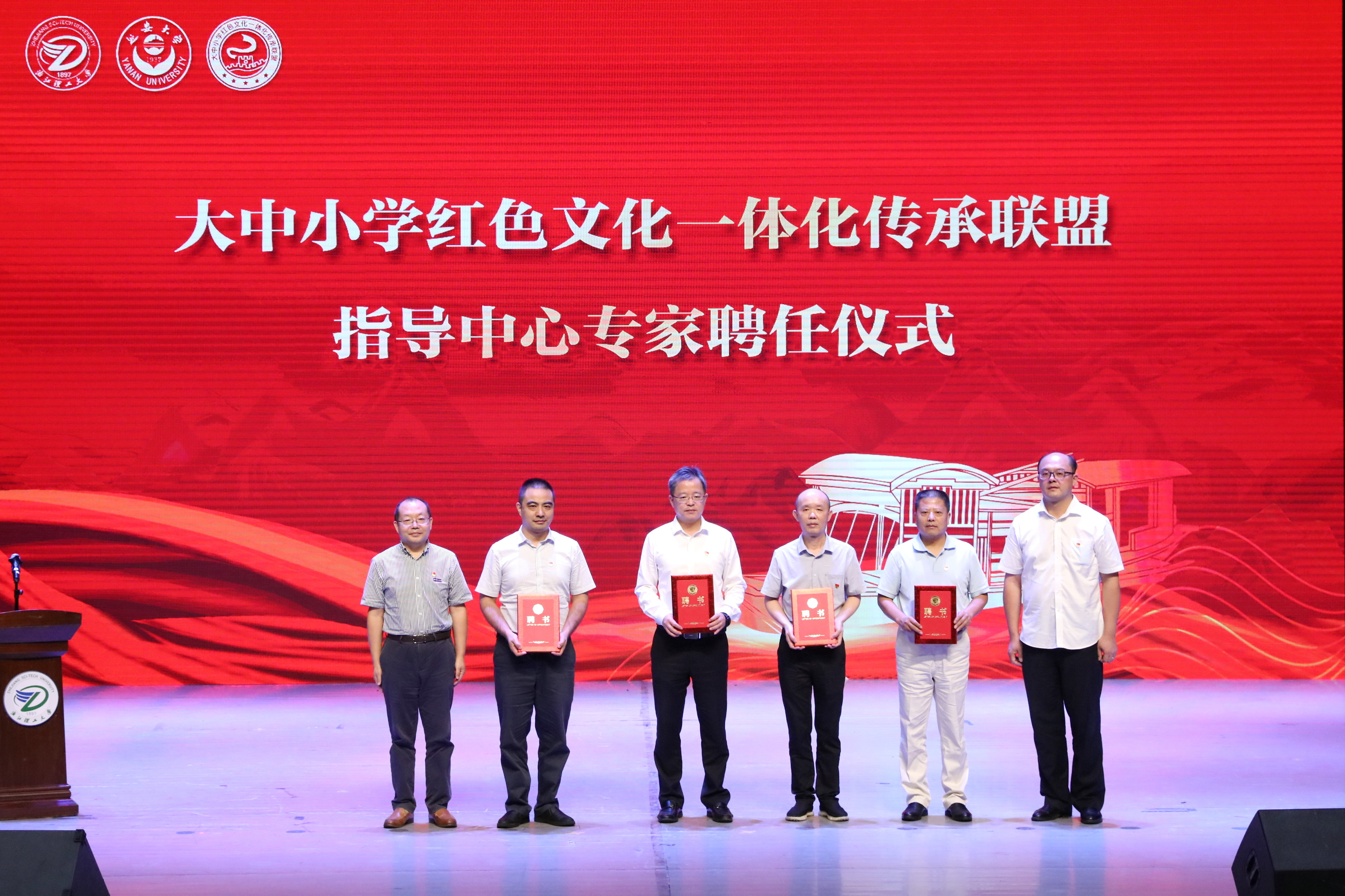 邢恒超、学校党委学工部部长胡琦为大中小学红色文化一体化传承联盟指导中心成立揭牌。延安大学党委学工部部长张翔通过视频连线祝贺联盟指导中心的成立。中心聘请浙江省委党史与文献研究室、延安革命纪念馆、南湖革命纪念馆、浙江革命烈士纪念馆、陕西省延安精神研究中心等机构负责人担任指导专家。