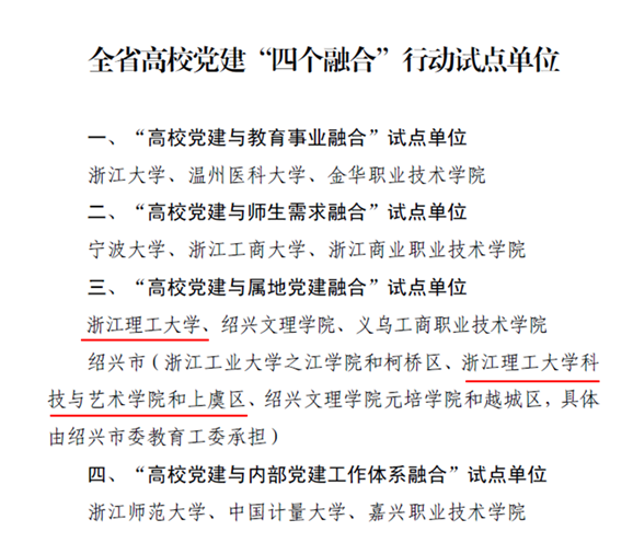 9月15日,浙江省委教育工委下发《关于确定高校党建“四个融合”行动试点单位的通知》,我校成功入选全省高校党建“四个融合”行动试点单位,成为“高校党建与属地党建融合”试点单位之一。