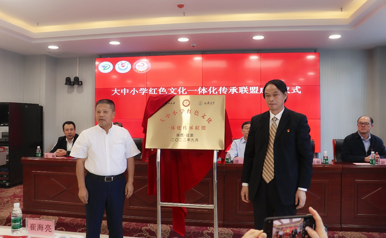 渠长根和延安大学附属中学常务副校长李化才共同为大中小学红色文化一体化传承联盟揭牌,这也标志着大中小学红色文化一体化传承联盟工作开启了校际合作新的里程碑。