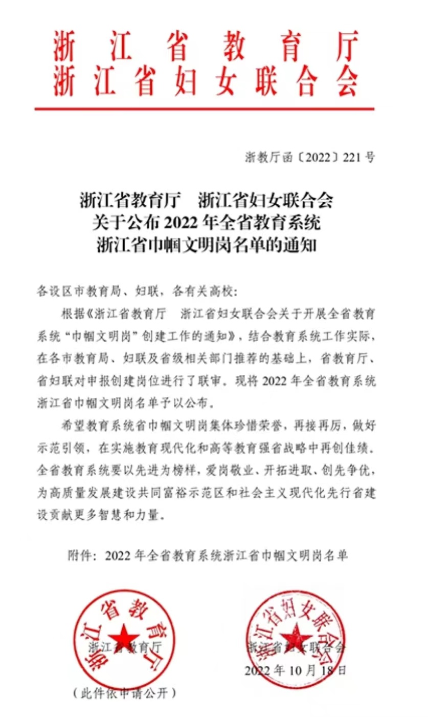 近日,浙江省教育厅、浙江省妇女联合会公布了2022年全省教育系统浙江省巾帼文明岗名单,我校计划财务处荣获“浙江省巾帼文明岗”称号,这是我校首次获得“浙江省巾帼文明岗”殊荣。
