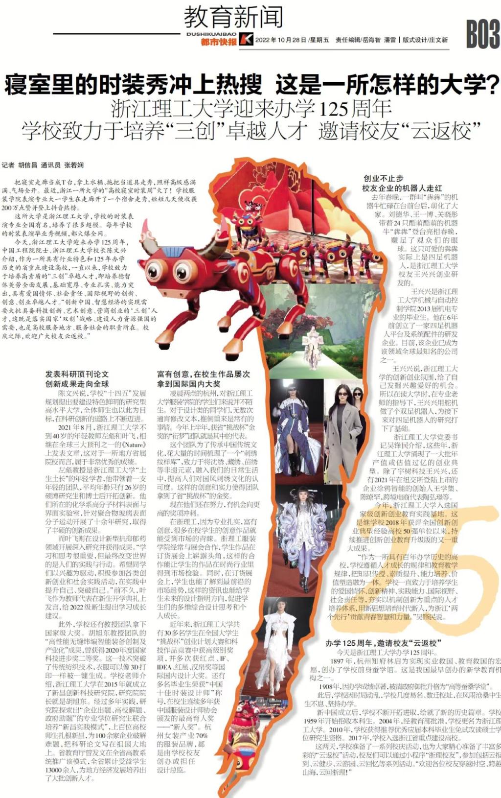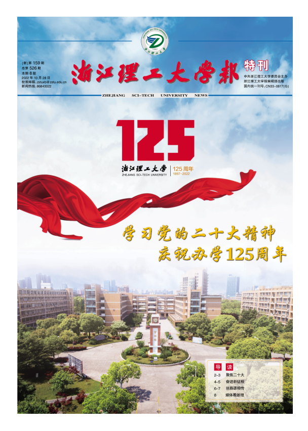 10月28日,mk官方网站_mk(中国)迎来了办学125周年。一个多世纪以来,mk官方网站_mk(中国)的发展与国家民族紧密相连,一代代浙理工人秉承“求知求实、创新创业”的办学传统,以报效国家、服务社会为追求,以教育兴国、科技报国、人才强国为己任,用坚实笃定的行动脚步、诠释了浙理工人的使命担当。近日,《中国教育报》《都市快报》纷纷以大版面报道展示学校办学125周年的历史与成绩。学校也在校庆当天,推出《mk官方网站_mk(中国)报》特刊,献礼党的二十大,庆祝办学125周年。