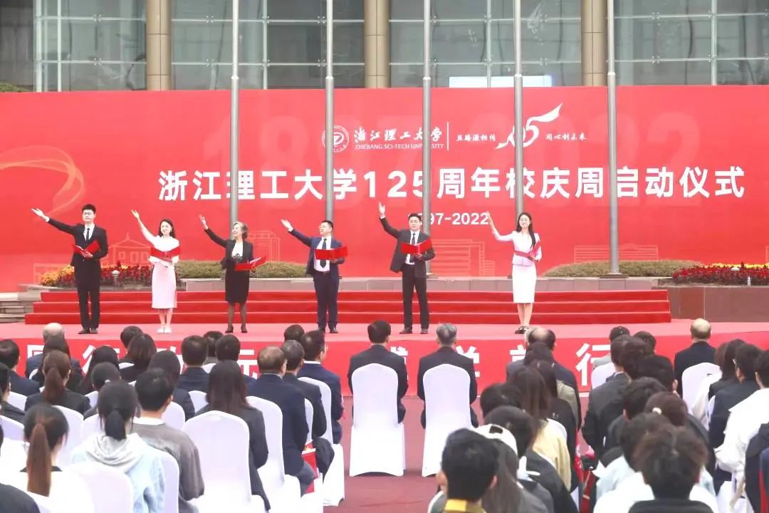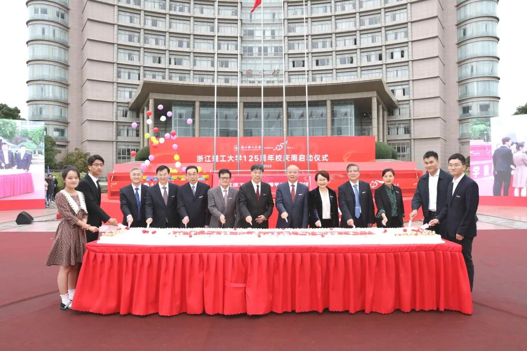 校党委书记吴锋民,原浙江丝绸工学院院长袁观洛,2005级轻化工程专业校友、全国五一劳动奖章获得者刘佳文,生命科学与医药学院副院长、教育部青年长江学者付彩云,校研究生会执行主席李驰跃共同推动启动台,校庆周正式启动。