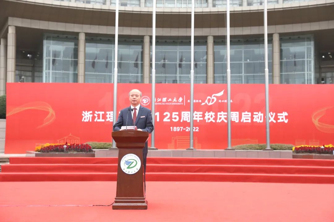 中国工程院院士、校长陈文兴致辞。陈文兴向为学校建设和发展作出贡献的前辈先贤、老领导老同志们表示崇高敬意。向全校师生员工、海内外校友和关心支持学校发展的社会各界人士致以诚挚问候和衷心感谢。他回顾了学校的办学历史,指出学校虽数易校名,数迁校址,风雨沧桑,历经磨难,但一直不改办学本心。如今,学校正式进入了“三校区一中心”的发展格局,办学水平和综合实力不断提升,校园面貌日新月异。他强调,校庆活动周启动仪式,既是对125年办学历程的温情回顾,也为全体“浙理人”吹响了奋进新征程的“前进号角”。进入新发展阶段,学校将朝着擘画第三次党代会提出的“争千进百创一流”的发展蓝图,锚定“十四五”规划确立“三个一流”的发展目标,坚持高质量内涵式发展,着力打造四个“高地”,不畏风浪、攻坚克难、只争朝夕,在实现民族复兴的伟大征程中书写更加精彩、更加辉煌的理工新篇章!