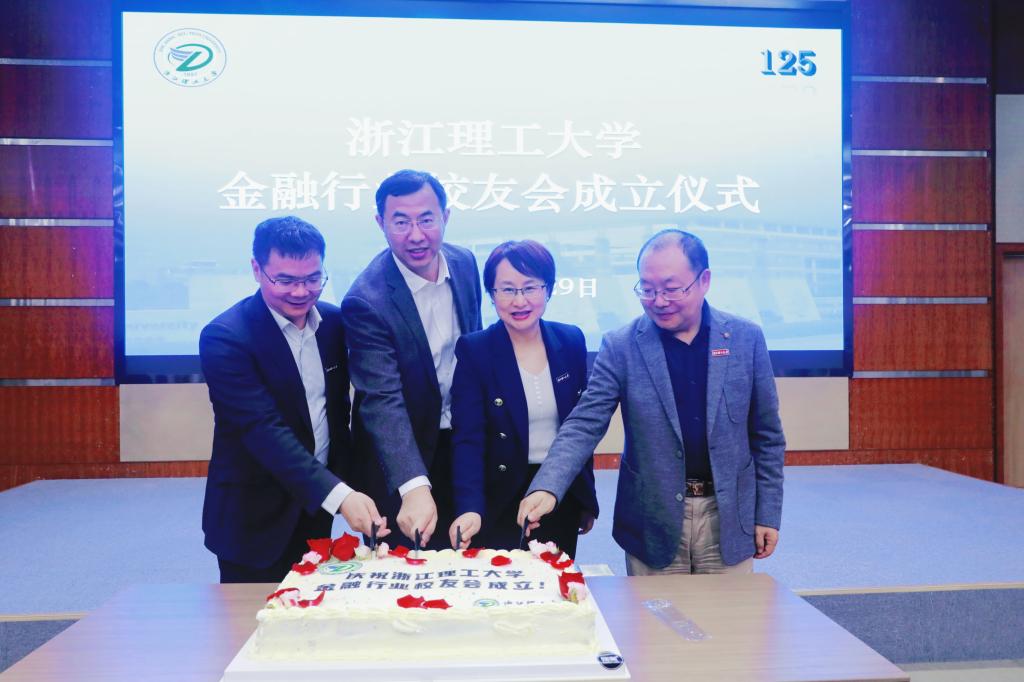 姚珺、汤铭、吕品和潘旭伟一同上台开启祝福蛋糕,全场唱响生日祝福歌曲。随后,汤铭和杭州校友会秘书处常务副秘书长阮国江共同揭牌“金融行业校友之家”,开启校友返校交流的新空间。
