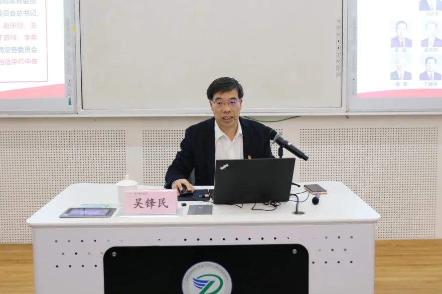 课上,吴锋民结合校长陈文兴作为党的二十大代表光荣参会的生动案例,介绍了党的二十大概况。吴锋民强调,党的二十大回顾总结了过去五年的工作和新时代十年的伟大变革,宣示了“两个确立”的决定性意义,取得了重大的政治成果、实践成果、理论成果、战略成果、制度成果,为新时代新征程党和国家事业发展、实现第二个百年奋斗目标指明了前进方向、确立了行动指南。