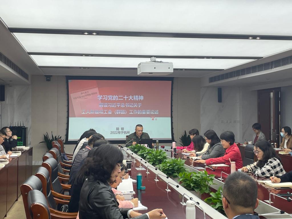 18日上午,省总工会干校陆明教授应邀在培训会上作关于“学习党的二十大精神,解读习近平关于工人阶级和工会(群团)工作的重要论述”的主题报告。陆明简要解读了党的二十大报告,深入解析了习近平与全总新一届领导班子集体谈话时提出的五点要求,结合全国总工会十七大报告提出的八个坚持,重点围绕四个方面梳理了习近平关于工人阶级和工会(群团)工作的重要论述,一是始终坚持正确政治方向,坚决维护习近平的核心地位;二是牢牢把握我国工人运动的时代主题,紧紧依靠工人阶级;三是高举维护服务职工权益旗帜,关注职工群众的核心诉求;四是依法治国是构建和谐社会及和谐劳动关系的基础。计划财务处后勤财务科科长詹珺雁就工会经费报销存在的问题和注意事项进行了梳理和提醒。张信群对近期工会工作进行了部署。