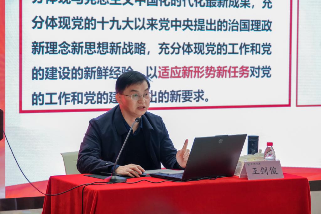 王剑俊以陈文兴校长作为党的二十大代表光荣参会的例子开篇,从“简要回顾党的二十大的基本情况”“学习党的二十大精神的重要意义”“全面准确学习领会党的二十大精神”三个部分对党的二十大报告进行梳理,重点从九个方面的“深刻领会”系统全面深入地解读了党的二十大精神。