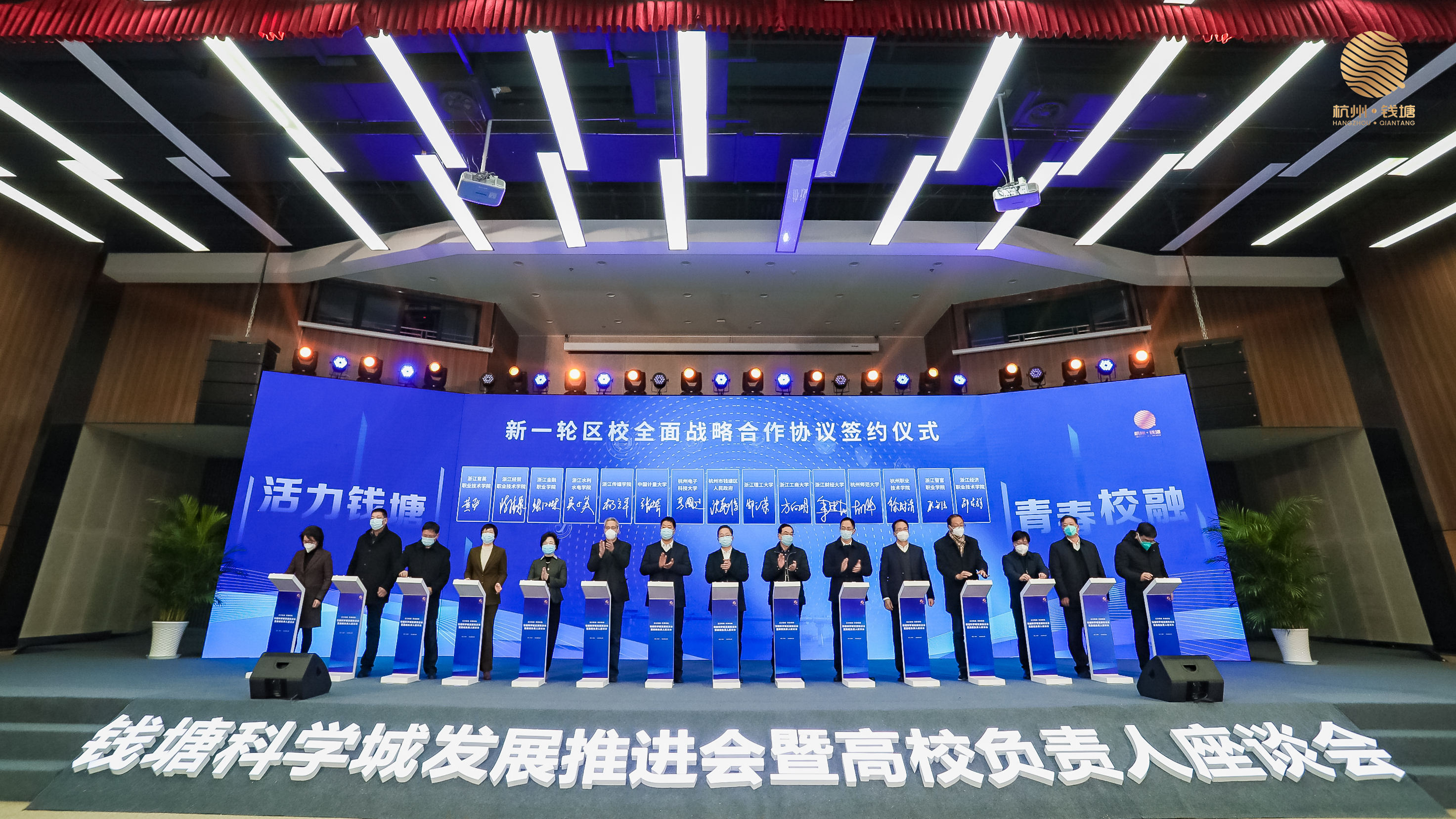 座谈会上,各高校、钱塘科技创新中心、中国科学院基础医学与肿瘤研究所负责人就深化区校合作、助推钱塘科学城建设以及钱塘高质量发展深入交流,为区校共赢发展提出了许多建设性的意见建议。现场还介绍了“钱塘校融·产学研一体化服务平台”和区校合作政策,钱塘与高校共同签订新一轮区校合作战略协议。