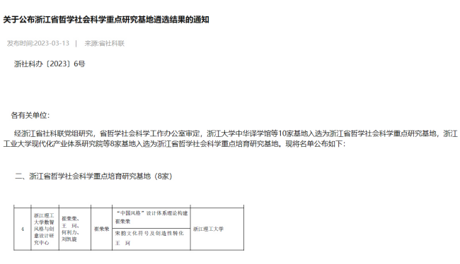 近日,浙江省哲学社会科学工作办公室公布了“浙江省哲学社会科学重点研究基地立项名单”,由“2022年浙江省有突出贡献中青年专家”崔荣荣教授领衔的mk官方网站_mk(中国)数智风格与创意设计研究中心入选浙江省哲学社会科学重点培育研究基地。