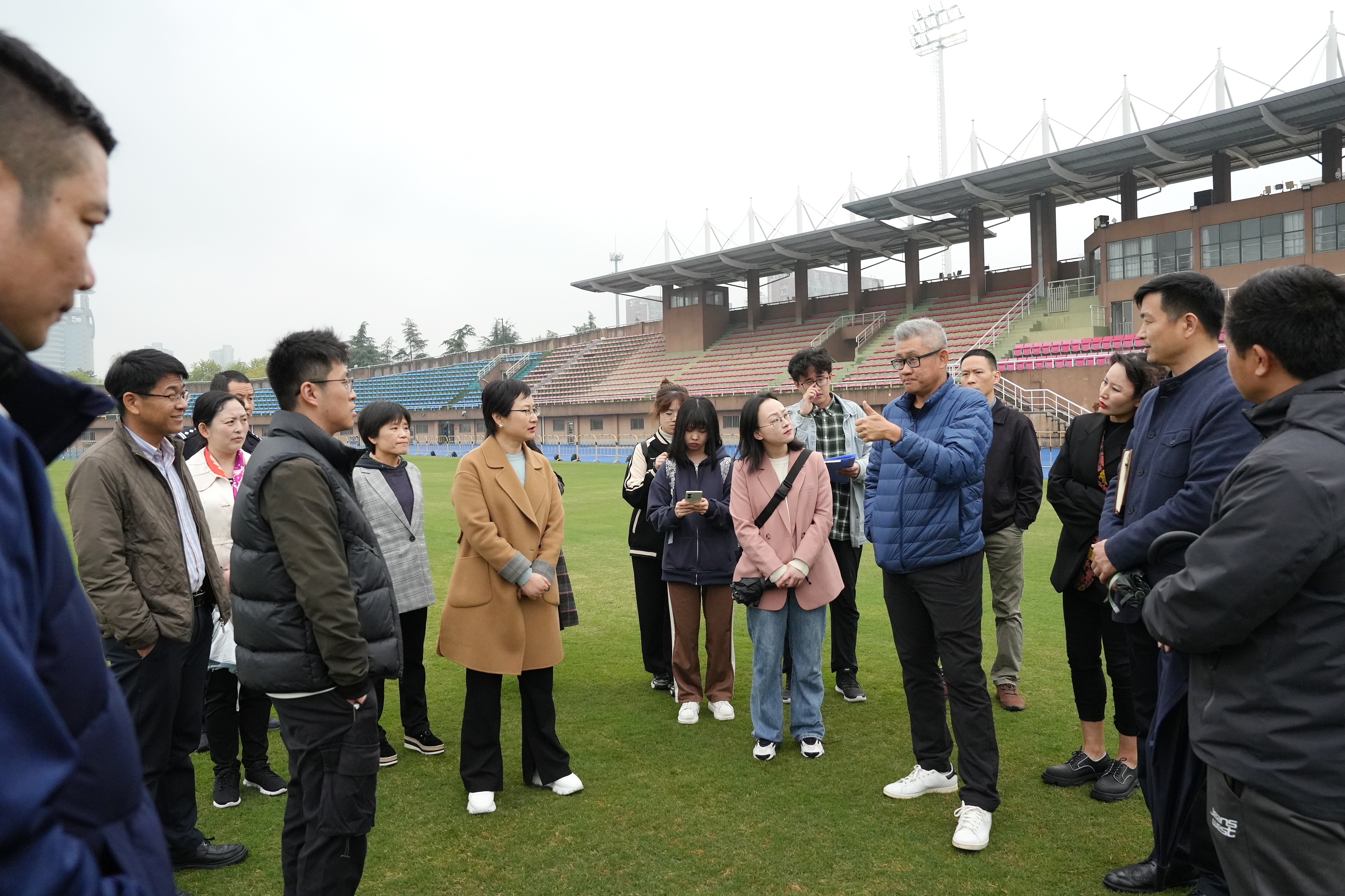 在工作人员的引导下,布莱恩一行先后来到万人体育场西大厅、功能房及体育场跑道、中央草地等处一一进行勘察。我校相关负责人介绍了目前团队运行的准备工作和进展情况。交流中,布莱恩一行就功能房器材设施、草坪维护、场馆运行等工作进行了指导。