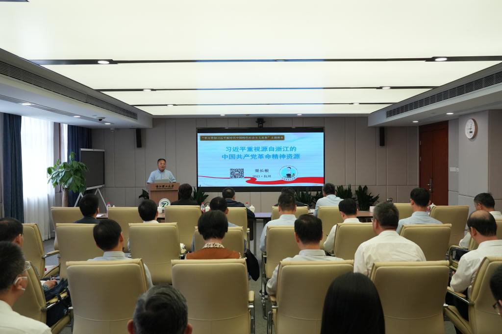 我校红色文化研究院院长、教授渠长根为全体党员干部讲授专题党课。渠长根重点围绕“中国共产党革命精神的一般认识”“伟大的建党精神与革命精神谱系”“努力讲好源自浙江的革命精神故事”等三个方面进行了多维度、深层次的讲解,全面解读红船精神与伟大建党精神的关系、中国共产党革命精神谱系的基本构成、源自浙江的中国共产党革命精神资源与中国共产党革命精神谱系的逻辑关系,以及源自浙江的中国共产党革命精神资源与习近平总书记的深厚渊源。整场党课主题鲜明、内容丰富、逻辑清晰,具有很强的思想性、理论性和指导性。课后,党员干部们还结合学习成果和工作实际进行了深入交流研讨。