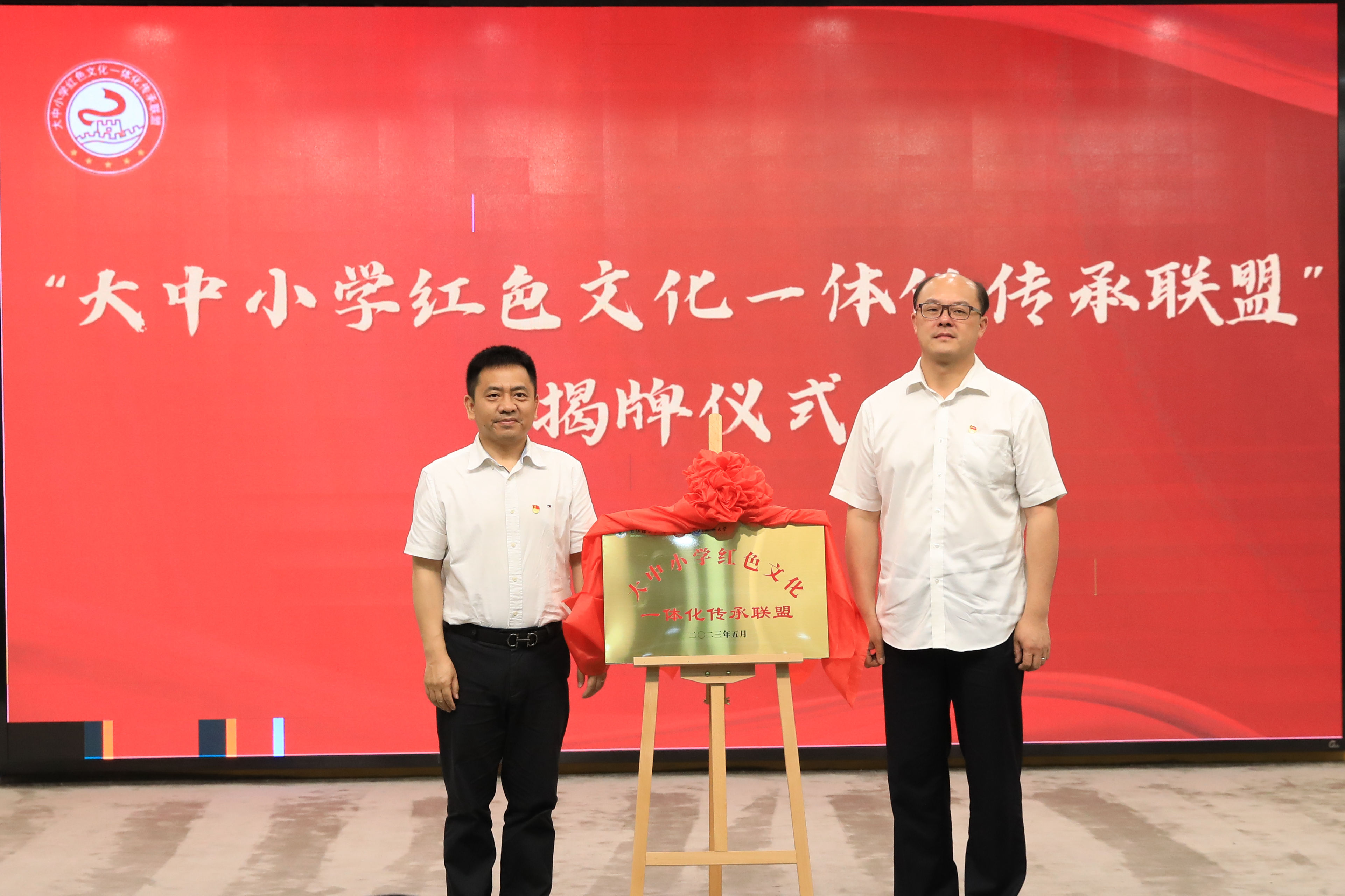 成立仪式上,校党委学工部部长、学生处处长胡琦,临平区教育局党委委员张禹共同为“大中小学红色文化一体化传承联盟”揭牌。