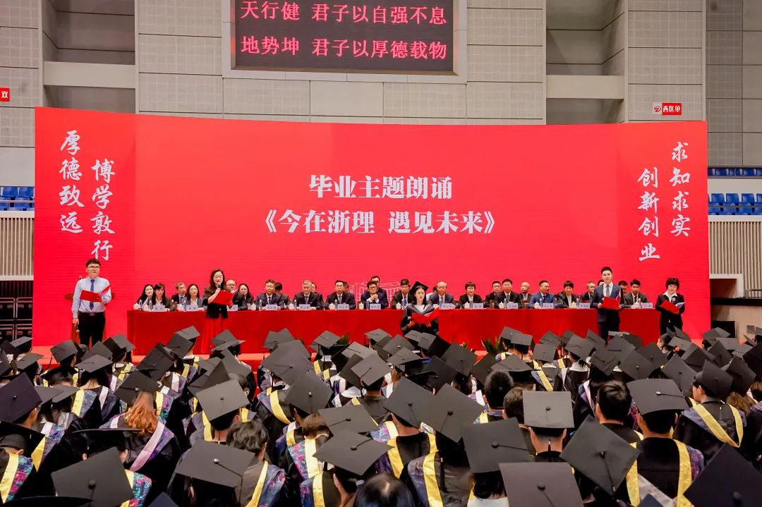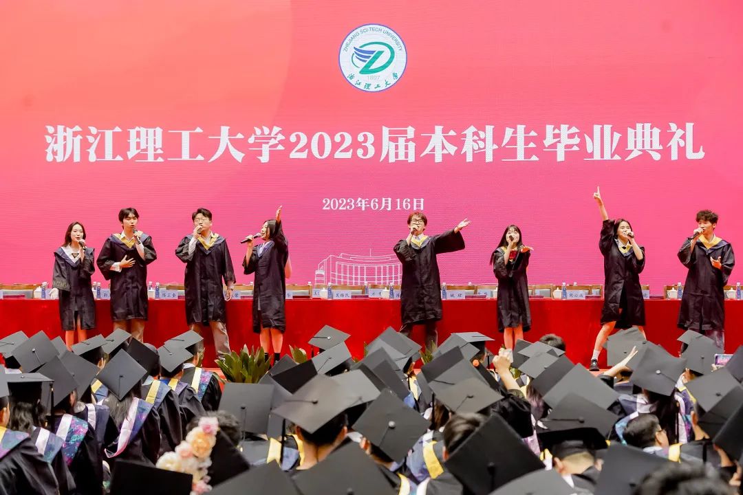 典礼上,教师代表苏淼、校友代表包林帆、辅导员代表章飚、宿管员代表张运菊和毕业生代表杜培研联袂带来毕业主题朗诵。苏淼期待全体毕业生有灿烂的人生理想、有充满希望的人生际遇,鼓励毕业生们风帆已扬,炽热少年当赴馥郁未来。包林帆祝贺临平校区首届毕业生顺利毕业,向4000多名学弟学妹加入18万理工校友大家庭表示热烈欢迎。章飚表示三年疫情已散,此去皆坦途,勉励全体毕业生用创新创意创业的态度去尽情拥抱世界、迎接未来。张运菊向毕业生们送上祝福,希望毕业生能常回来看看,浙理永远是家。杜培研向培养2023届毕业生的全体浙理师长表达了深切的感激,她号召全体浙理学子与母校从双向奔赴到同频共振,一起拥抱更好的明天,并发出“浙理有梦,锚定双一流,一起向未来;强国有我,青春燃火炬,我们是未来”的青春宣言。