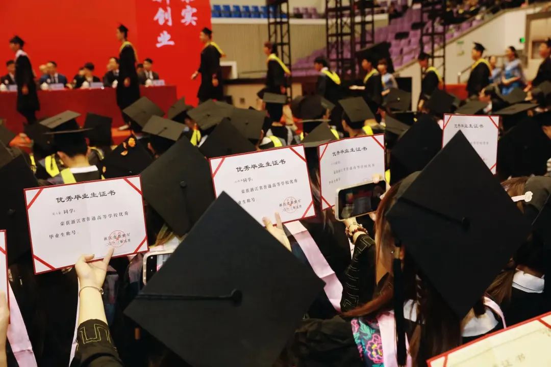 副校长郜正荣宣读了2023届省级优秀毕业生、校级优秀毕业生名单。主席台就座的领导为省级优秀毕业生、校级优秀毕业生代表颁发了荣誉证书,为2023届本科毕业生校友工作联络员颁发了聘书。学校为每位同学定制了纪念水晶章,内嵌了校园标志性建筑——宝铎楼,寓意浙理与每位同学心心相印、双向奔赴!