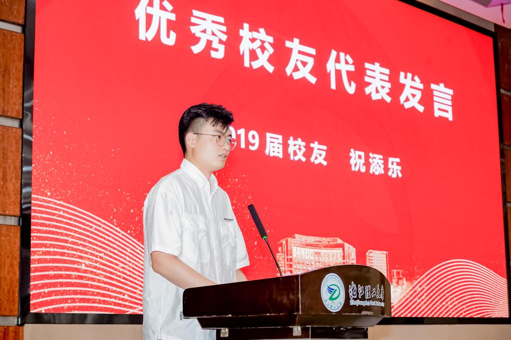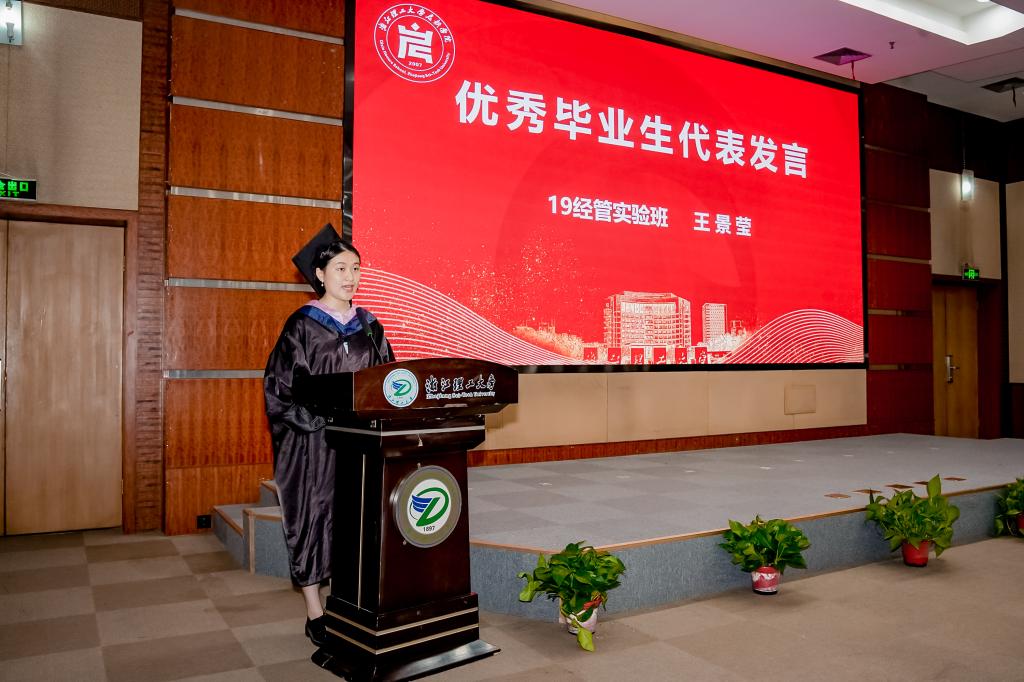 校长特别奖奖学金、“外研社·国才杯”全国大学生英语演讲大赛全国一等奖获得者王景莹同学作为毕业生代表发言,她回顾了大学四年的点滴生活,表达了对师生的感激和对母校的祝福。学院2019届毕业生、第四届全国大学生就业创业事迹人物获得者祝添乐受邀作为校友代表发言。他结合自身工作经历,勉励全体毕业生要坚定青春理想,以勇立潮头的气魄踔厉奋发;要坚持苦中作乐,以攻坚克难的精神勇毅前行;要坚守初心使命,以矢志不渝的信念行稳致远。他祝福毕业生们砥砺前行,未来可期。