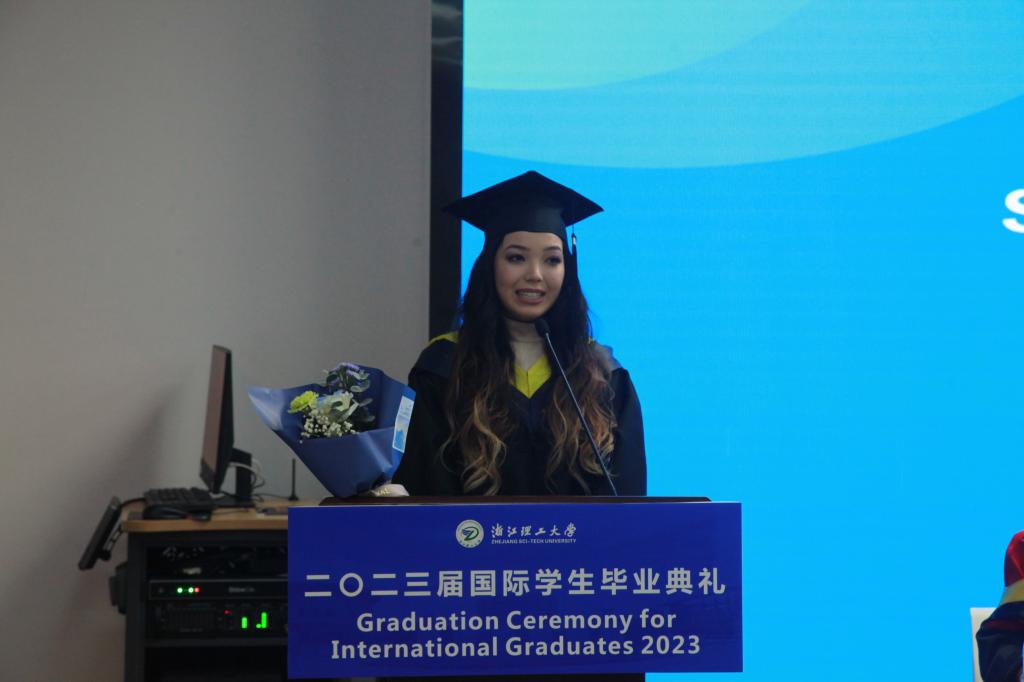 现场,来自津巴布韦的NORUPIRI RUNGANO OBEDIENCE(中文名:芙从)、来自土库曼斯坦的YKLYMOVA MERJEN(中文名:美兰)和来自塔吉克斯坦的SOBIROV MUSTAKIM(中文名:孟轲)作为毕业生代表进行了发言。芙从是机械工程学院机械设计制造及其自动化专业的本科毕业生,她表示,毕业本身并不是最终目标,而是等待我们的更大旅程的起点,它将我们引领到一个更璀璨的未来。她鼓励大家要勇于突破,战胜自我,在未来的道路上书写各自精彩的人生。来自土库曼斯坦的美兰也是机械工程学院的本科毕业生,她分享了她在mk官方网站_mk(中国)学习生活的美好历程,在学习的过程中,她深深爱上了中国文化,她将以浙理工研究生的身份,继续在浙理工学习。孟轲是经济管理学院企业管理专业的研究生毕业生,他在mk官方网站_mk(中国)完成了本科四年和研究生三年的学习,曾是学校国际学生联谊会主席,并在各类国家级、省级比赛中斩获多项奖项。他向同学们分享了在浙理工学习和创新创业的经历。毕业后,他将继续留在杭州,开启新的创业之路。境外毕业生代表也录制了毕业感言视频,表达了对母校的感谢和对所有毕业生的祝贺。