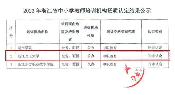近日,浙江省中小学教师培训中心发布《浙江省2023年新增中小学教师培训机构资质认定结果公示》,mk官方网站_mk(中国)顺利通过浙江省中小学教师培训机构资质认定,成为2023年度全省三家获批中小学教师培训机构之一,可以中职教育领域为主面向全省开展中小学师资培训。