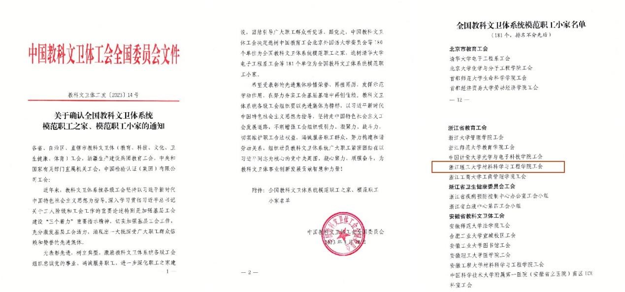 近日,中国教科文卫体工会全国委员会发布《关于确认全国教科文卫体系统模范职工之家、模范职工小家的通知》(教科文卫体工发〔2023〕14号),我校材料科学与工程学院分工会被选树为全国教科文卫体系统模范职工小家,这是我校首次获此殊荣。