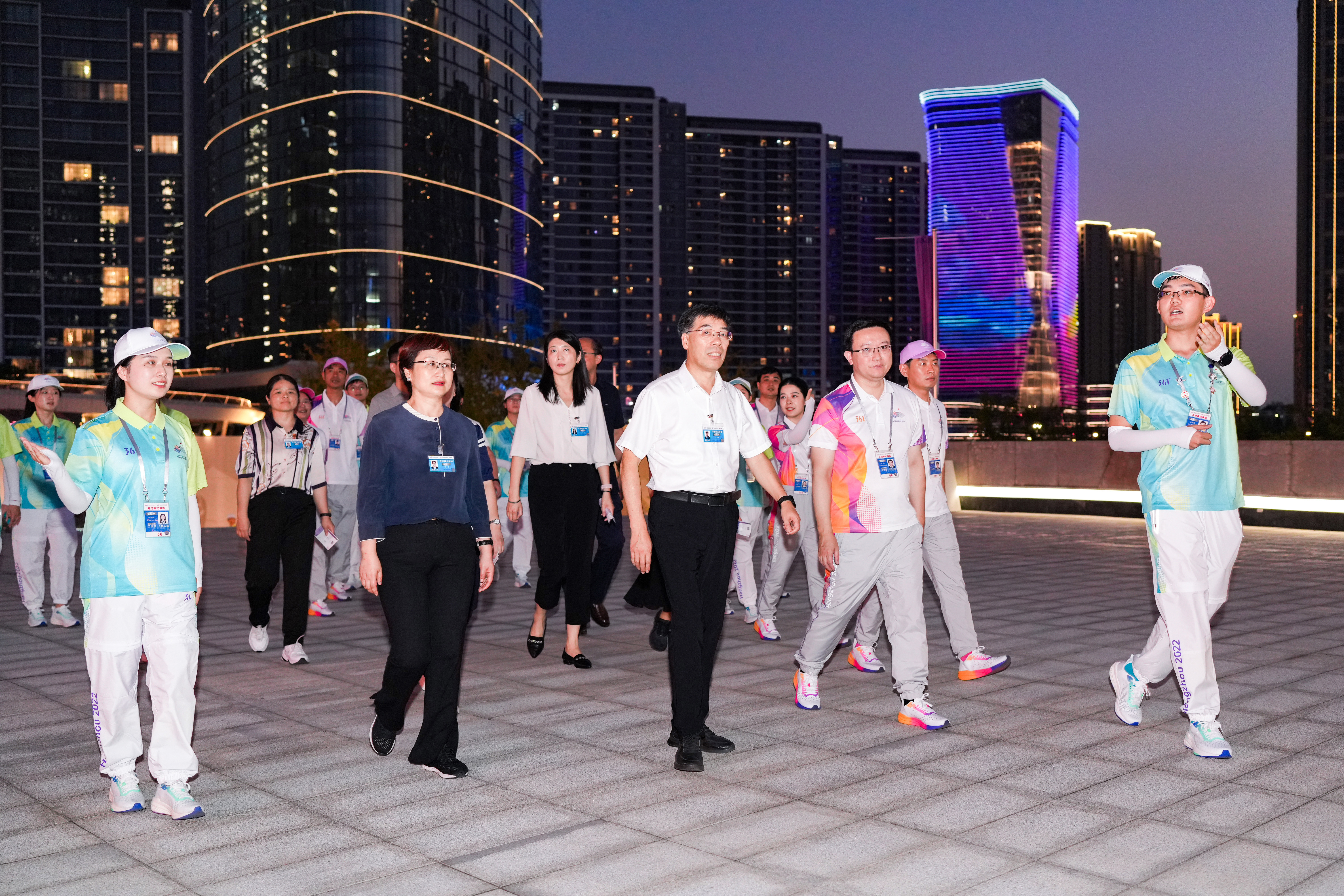 9月9日下午,校党委书记吴锋民、党委副书记姚珺一行到杭州奥体中心体育场(简称“大莲花”),看望慰问学校“大莲花”亚运会、亚残运会赛会志愿者及志愿者领队教师,杭州团市委书记、杭州亚组委志愿者部部长汪杰陪同。