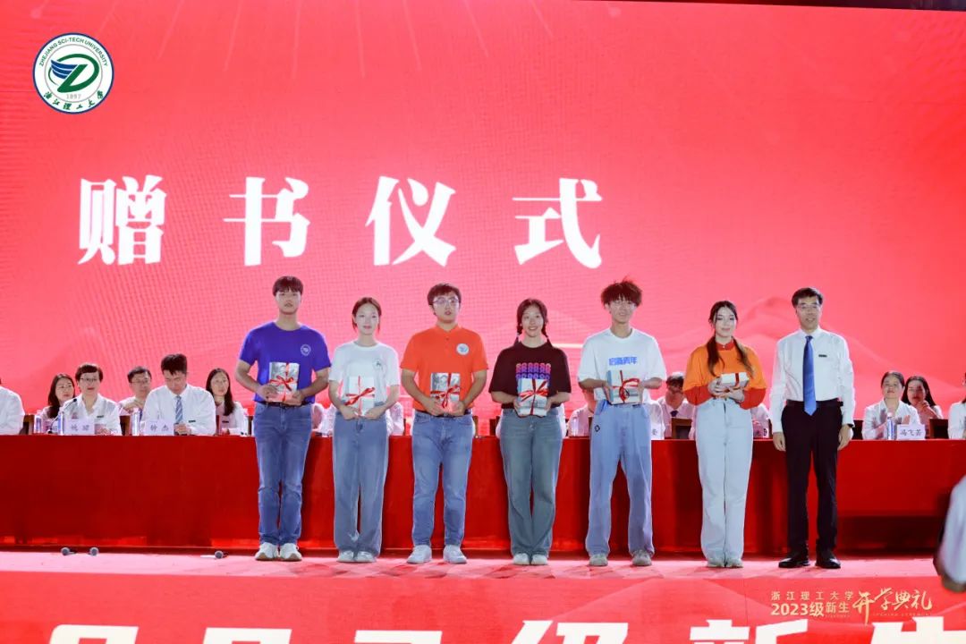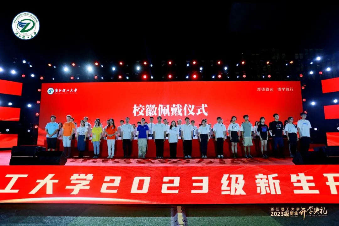 主席台领导为本科生、研究生和国际学生代表发放校徽,将“浙理人”的光荣身份授予每一位2023级新生,台上台下全体新生共同佩戴校徽,担起学校建设国家“双一流”大学的责任和使命。