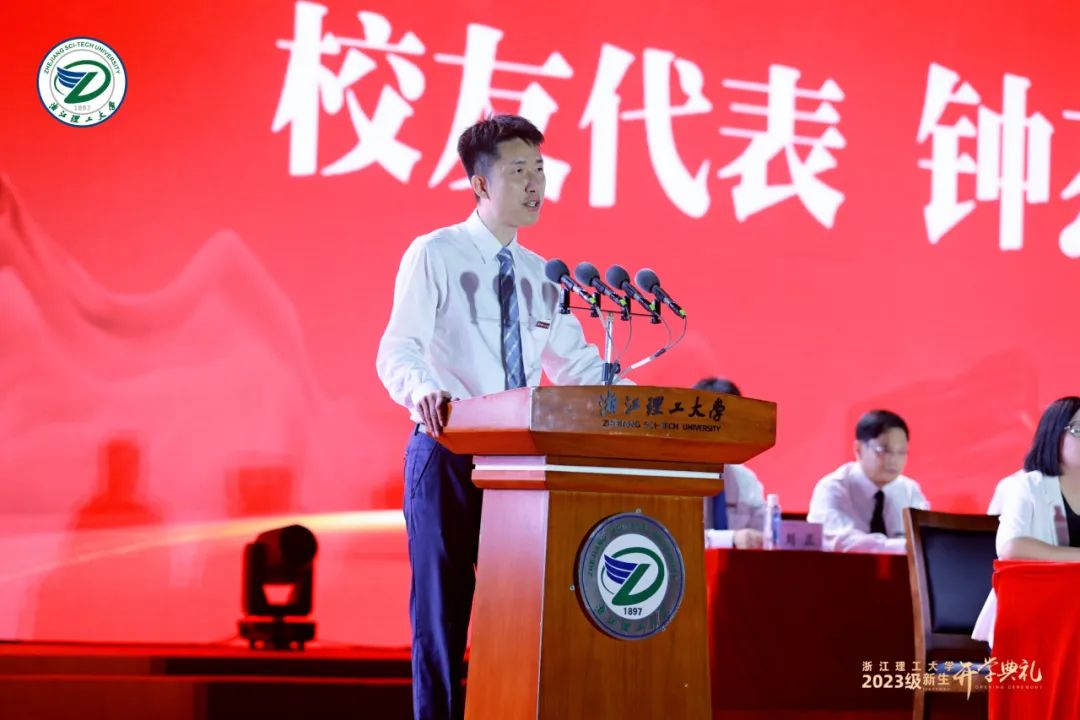 典礼上,2000级信息与计算科学专业校友钟杰作为校友代表发言。钟杰回顾了自己在学校的求学经历,他向全体提出了三点期待:第一,培养独立学习能力,坚定复合发展;第二,坚持学以致用,强化合作意识;第三,树立报国情怀,勇担时代使命。他期待全体新浙理工人以青春和梦想开启自己人生的灿烂篇章。