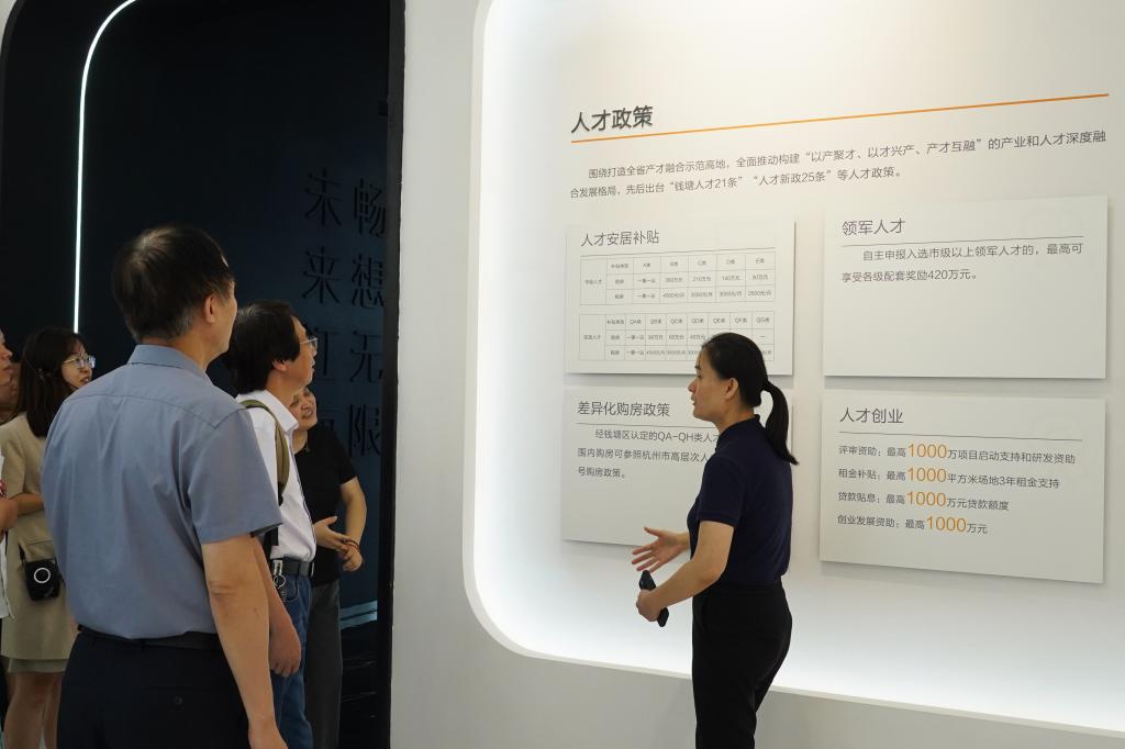 全体参会人员考察调研了钱塘区江海之城城市展厅、钱塘绿岛等城市发展建设项目,深入了解了钱塘区“一带两城”建设规划情况,畅谈工作思考与意见建议。在争创“双一流”、推进高水平大学建设方面,提出健全育才机制平台、加强学科融合创新、深化政产学研合作、优化完善评价体系等建议,全面提振学校发展的底气与信心;在深化校地融合、产教融合方面,提出共享实验室、共建产业研究院、共创实习实训基地、共治生态环境等方式,加强产业互通、人才对接、区校合作。