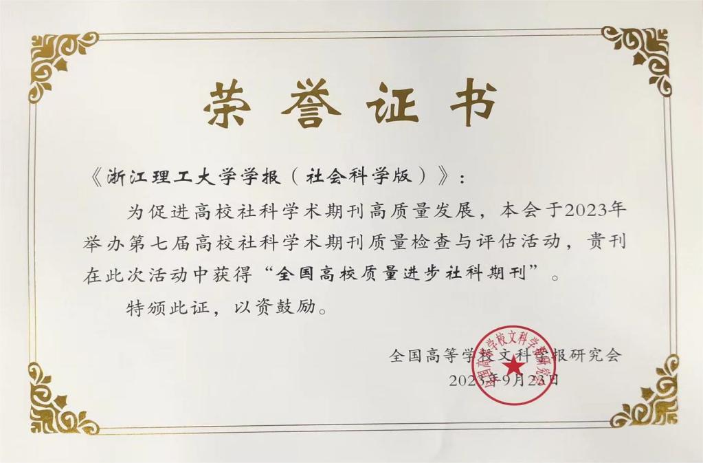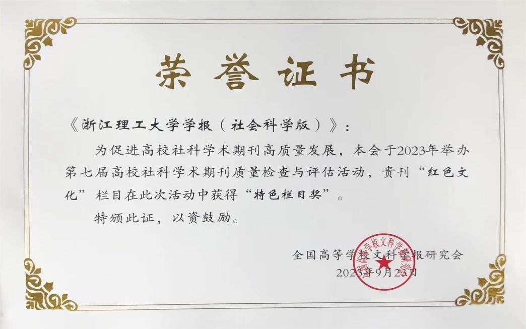 2023年9月23日,全国高等学校文科学报研究会九届三次理事会在三峡大学举行,会上公布了第七届高校社科学术期刊质量检查与评估结果,《mk官方网站_mk(中国)学报(社会科学版)》荣获“全国高校质量进步期刊”称号,其中“红色文化”栏目获得“特色栏目奖”。这是继2018年本刊获全国高等学校文科学报研究会“全国高校优秀社科期刊”荣誉称号后,再次获得的两项殊荣。