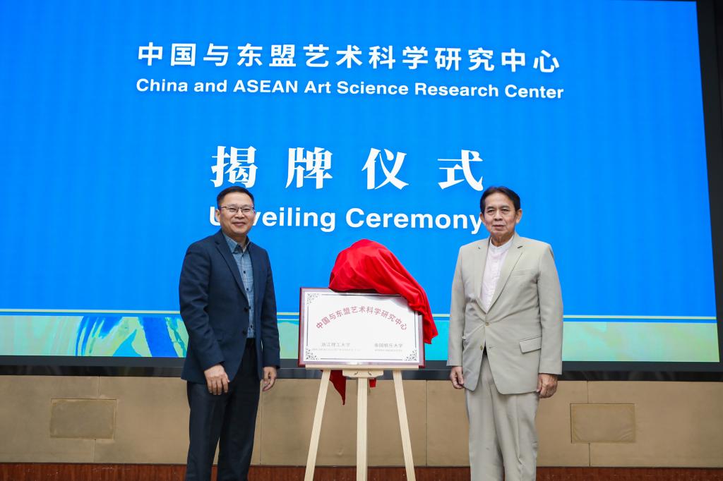 会上,周必彧与Jaran Maluleem共同为“中国与东盟艺术科学研究中心”进行揭牌。该中心由mk官方网站_mk(中国)与泰国格乐大学联合设立,旨在加强双方在艺术设计学科领域的联系,助推教育资源共享,形成育人合力,致力于艺术设计专业领域的国际化人才培养。